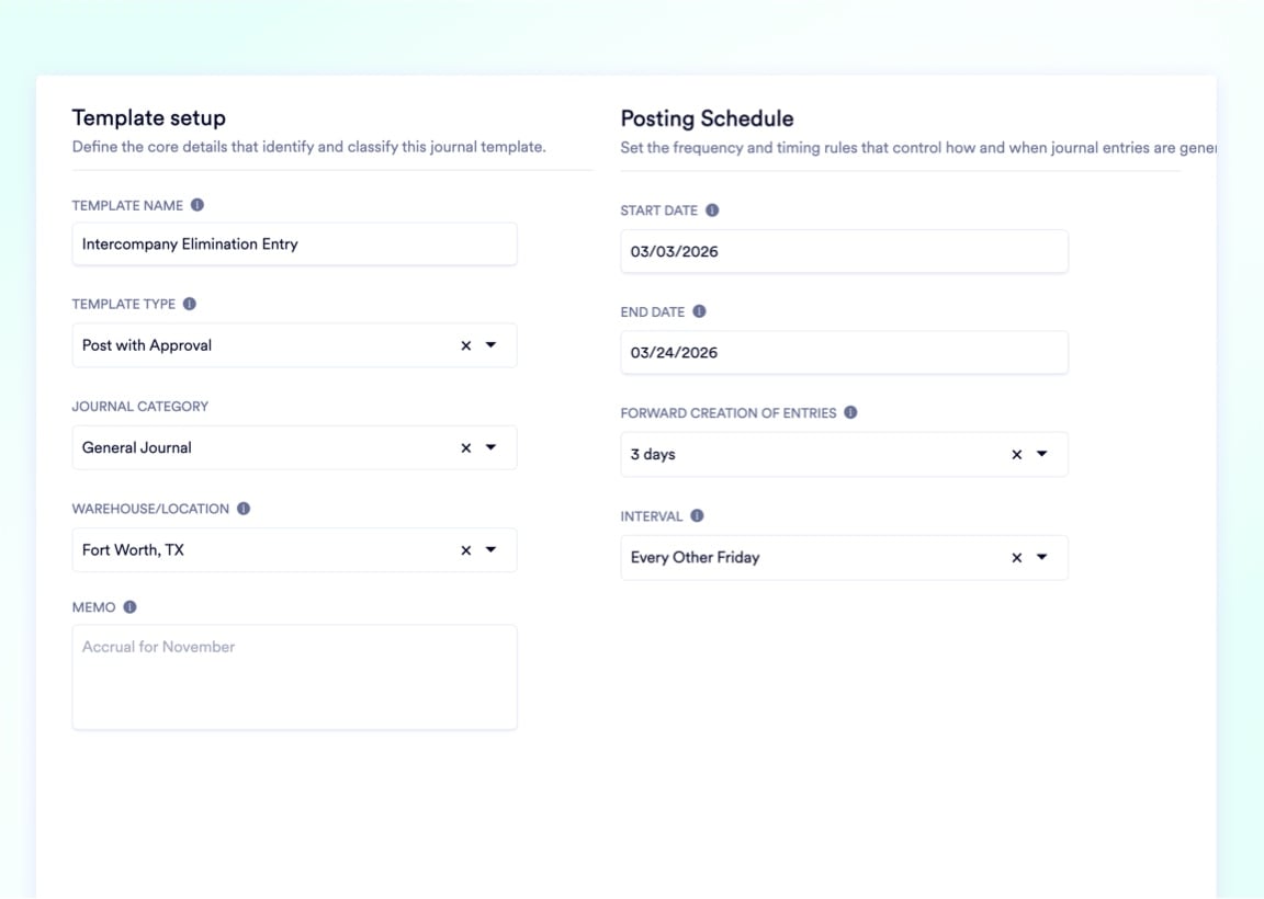Build recurring journal templates for rent, accruals, and depreciation. Choose auto-post, approval-required, or manual execution per template.