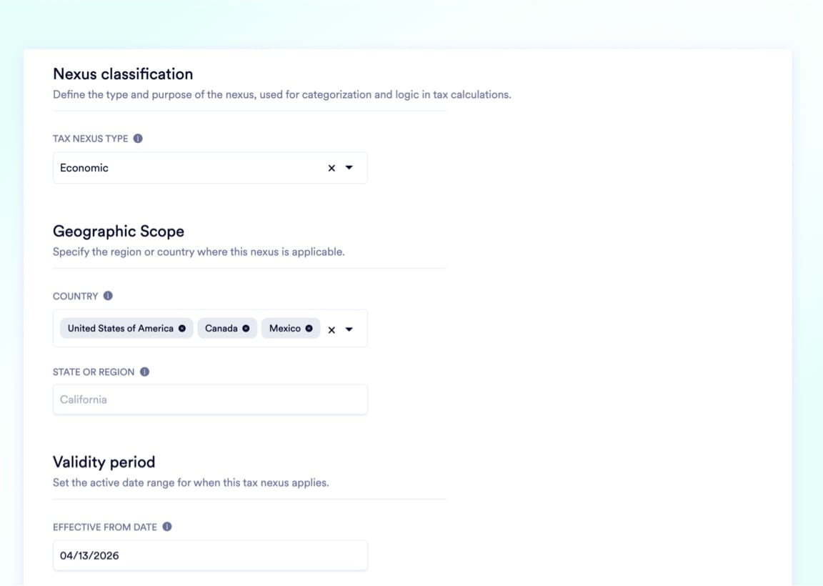 Define exactly where you owe tax. Set geographic scopes by country, state, or region with strict effective dates that track your expanding economic nexus.