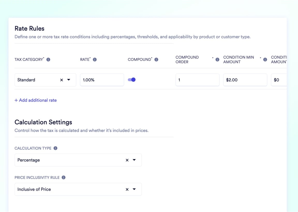 Compound Tax-on-Tax Canadian GST/PST, Indian IGST cascades, and regional surcharges that apply on top of base tax. Define exact compounding sequences and let the system handle the algebra.