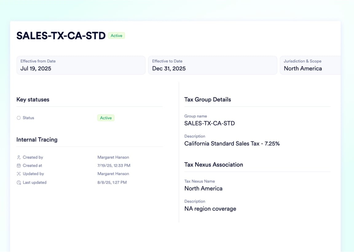 efine your legal tax obligations by country, state, region, or custom geographic boundary with strict effective date controls.
