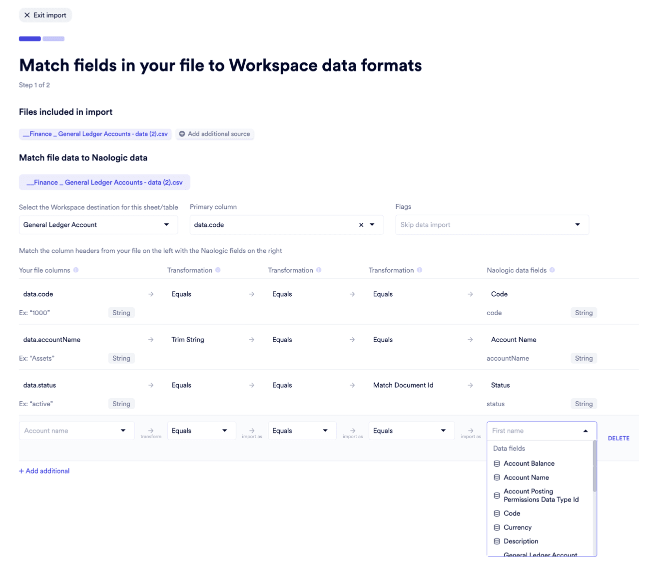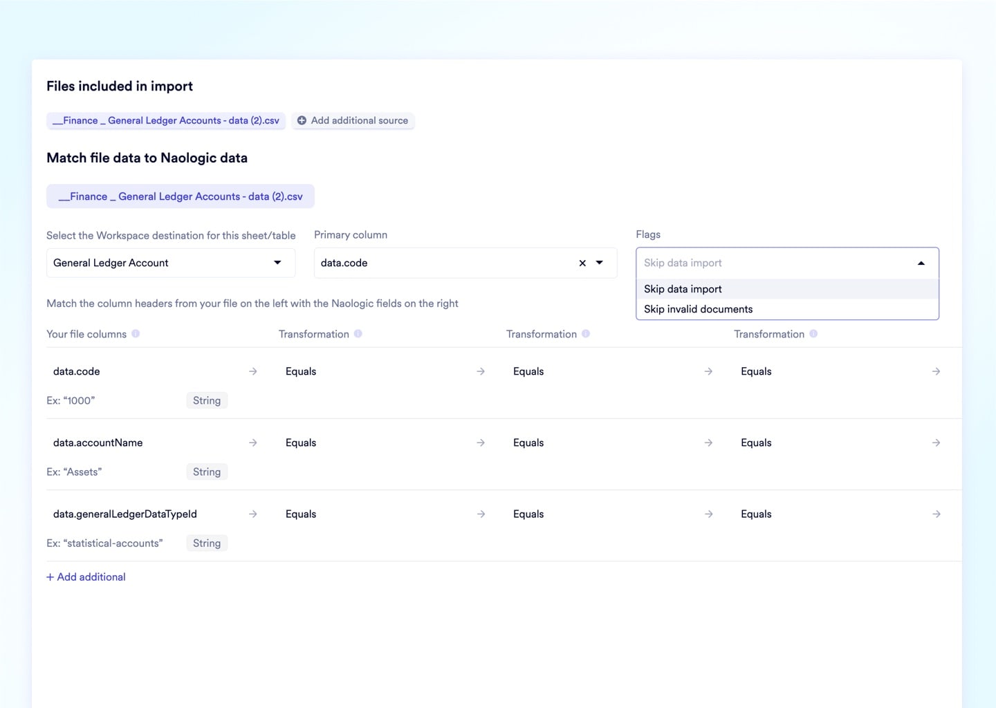 Upload CSV or Excel exports from any regional bank, map columns once using the visual matching interface, and Naologic populates hundreds of transactions into your ledger in seconds.