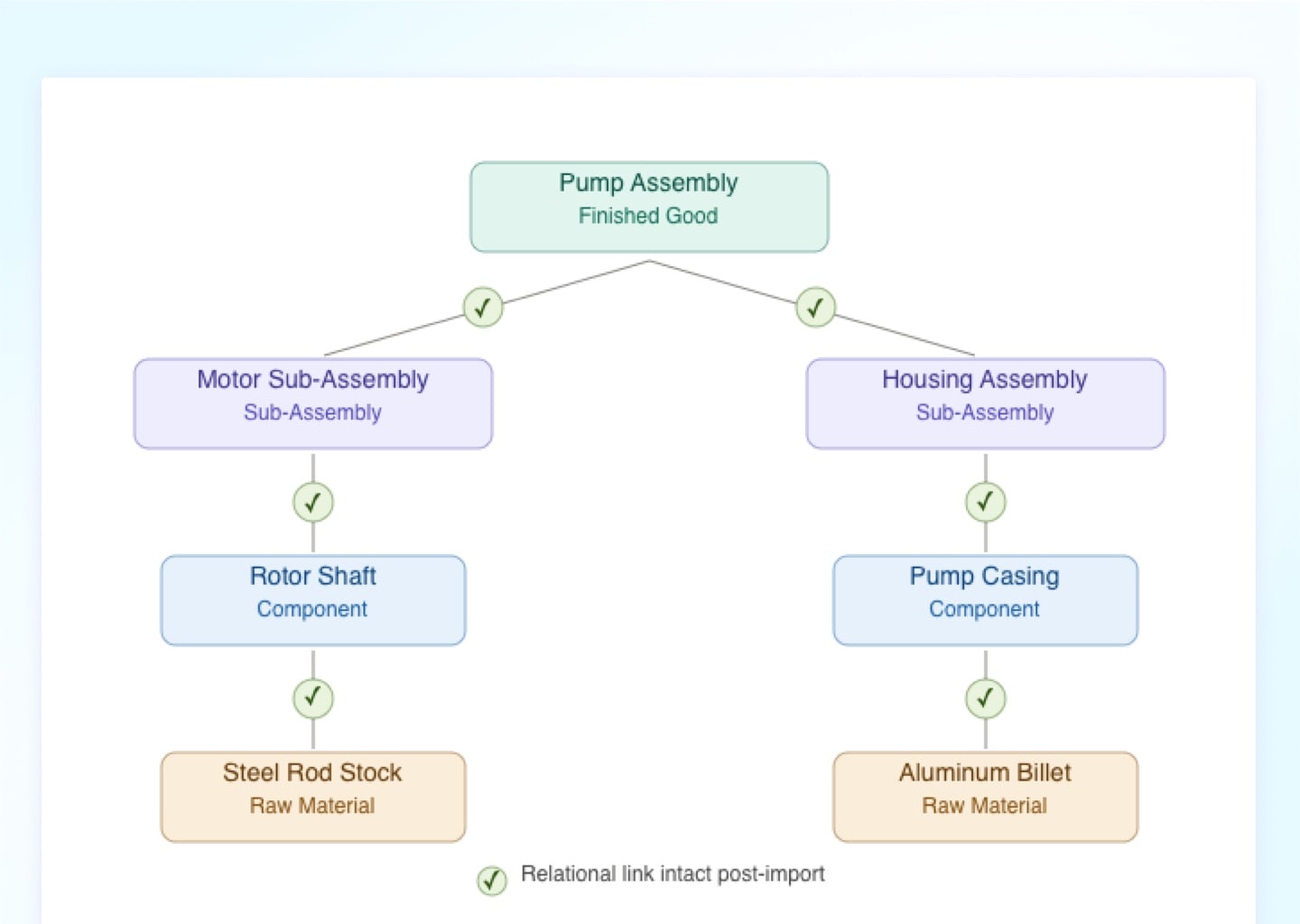 The importer natively resolves parent-child relationships. Multi-level Bills of Materials, routing steps, and sub-assembly dependencies import with every relational link preserved.
