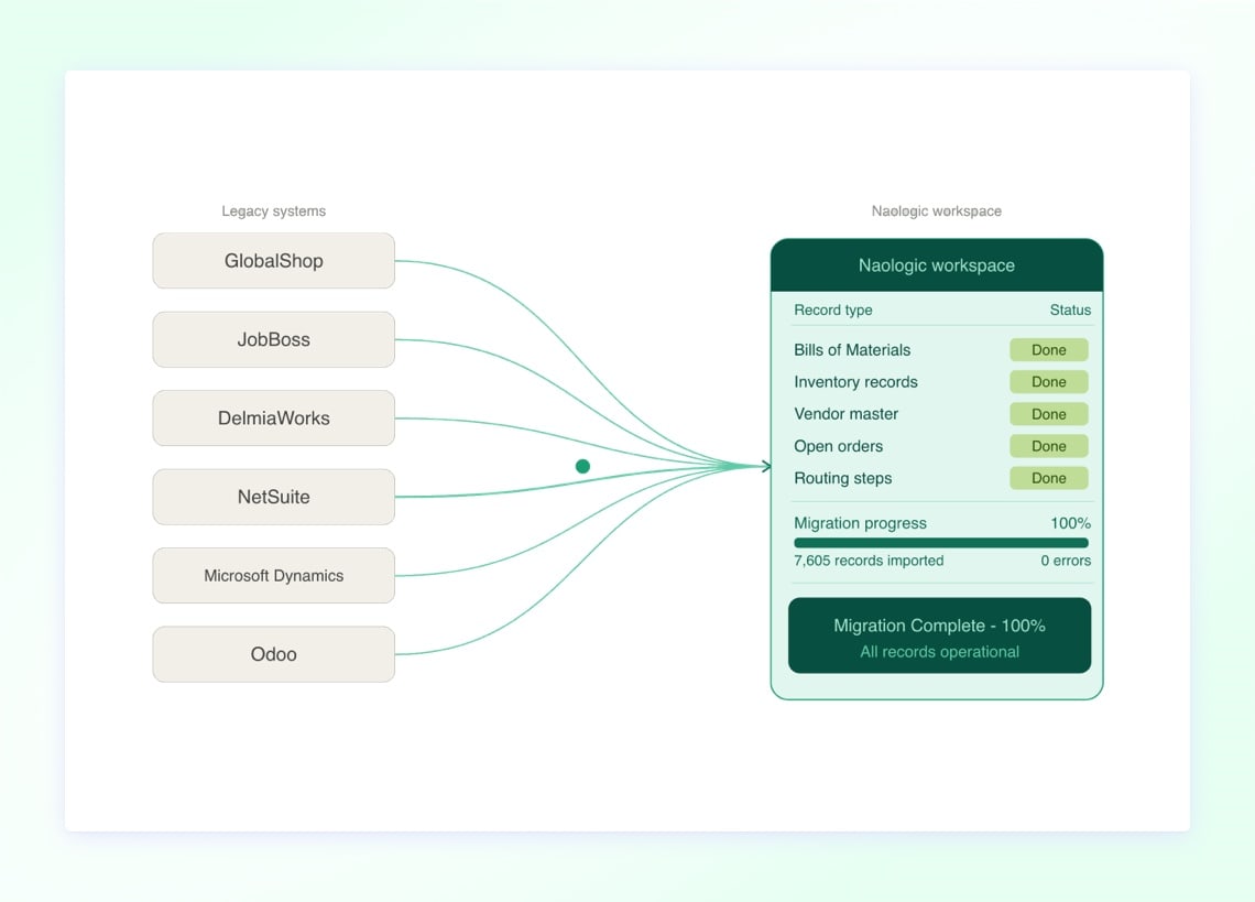 Naologic built custom extraction toolkits for the six most common legacy manufacturing ERPs. Our implementation team deploys proprietary connector scripts - or secure on-premise extraction protocols for local legacy systems - and works directly with your team until every BOM, inventory record, vendor list, and open order is fully operational in the new workspace. Migration is included for all customers with no consulting fees and no third-party project timelines. Image: Side-by-side showing legacy ERP logos (GlobalShop, JobBoss, DelmiaWorks, NetSuite, Microsoft Dynamics, Odoo) on the left with directed arrows pointing into the Naologic workspace dashboard on the right, overlaid with a "Migration Complete - 100%" progress indicator.