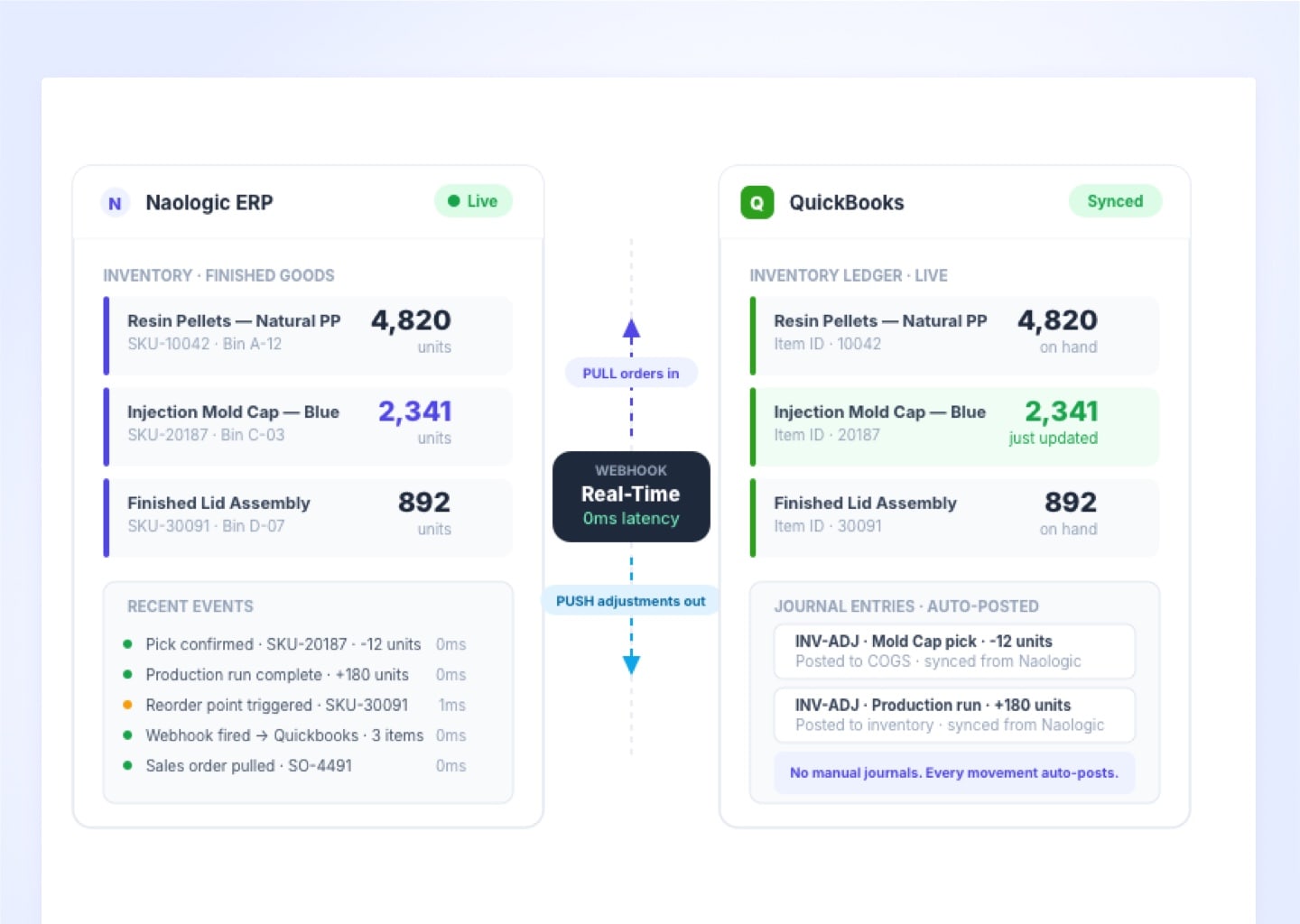 Push live stock counts to SAP and Quickbooks the instant a production run completes or a pick is confirmed. Pull confirmed orders back into Naologic for scheduling - with no middleware and no batch window introducing lag.