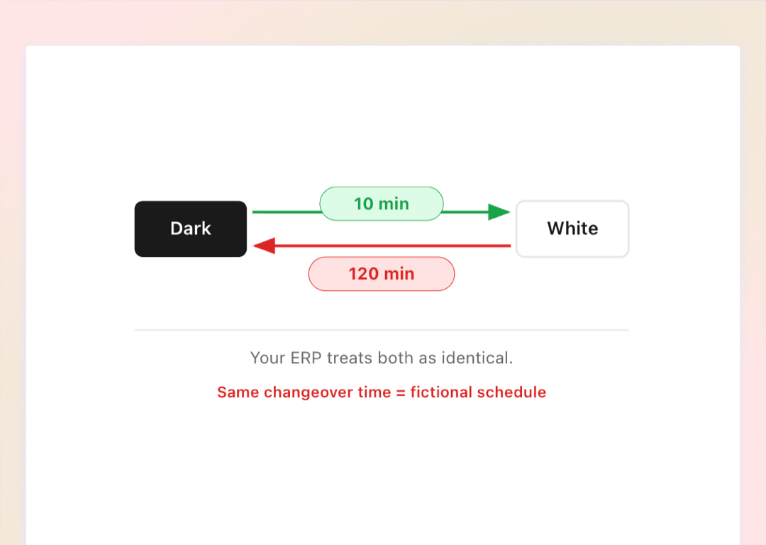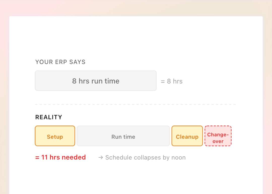 Legacy ERPs skip setup durations, cleanup windows, and tooling changeovers. Your 8-hour plan needs 11 hours of real machine capacity.