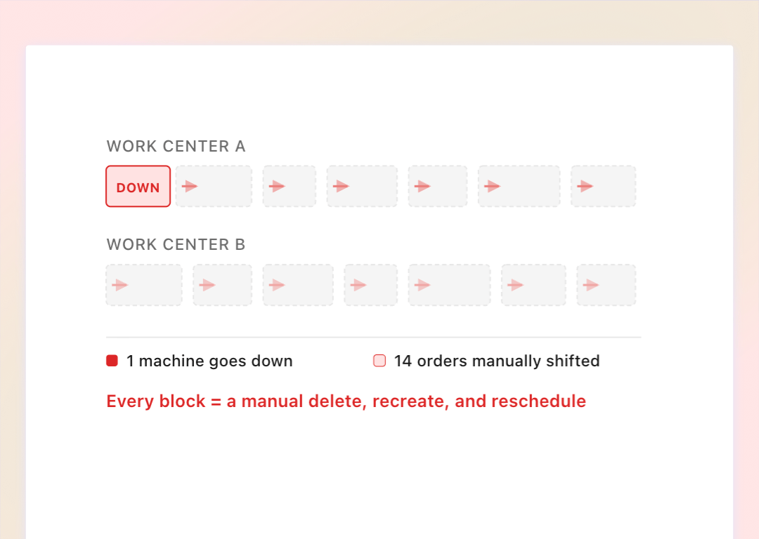 When a machine goes down, planners manually delete, recreate, and shift dozens of dependent orders. One disruption cascades into a full day of rework.