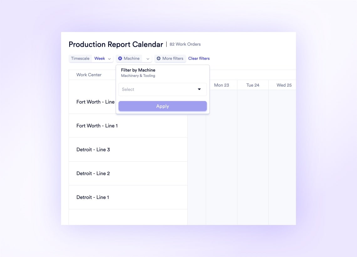 The Production Report Calendar plots finalized output data by manufacturing date, work center, and facility on an interactive visual timeline. Filter by facility to audit specific zones instead of scrolling through 200 flat spreadsheet rows.