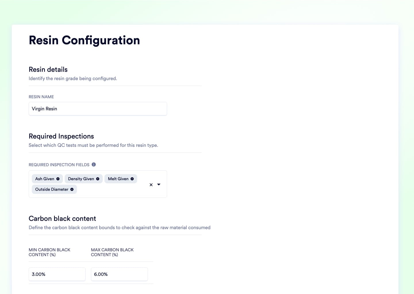 Track molecular material properties - density, melt index, Ash %, and Carbon Black min/max bounds - at the item level. If any raw material batch tests outside fractional limits, the system flags it for immediate rejection before it reaches the BOM.