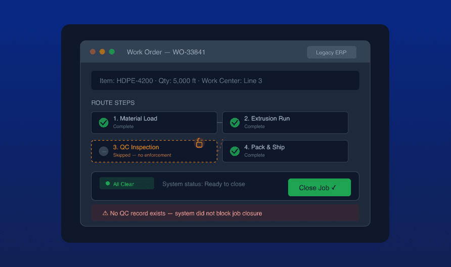 Mandatory In-Process Inspections Quality Control Points block route step completion until a passing, in-tolerance measurement is logged by name. No override. No supervisor workaround. The next routing step is physically inaccessible until the QC record is satisfied.