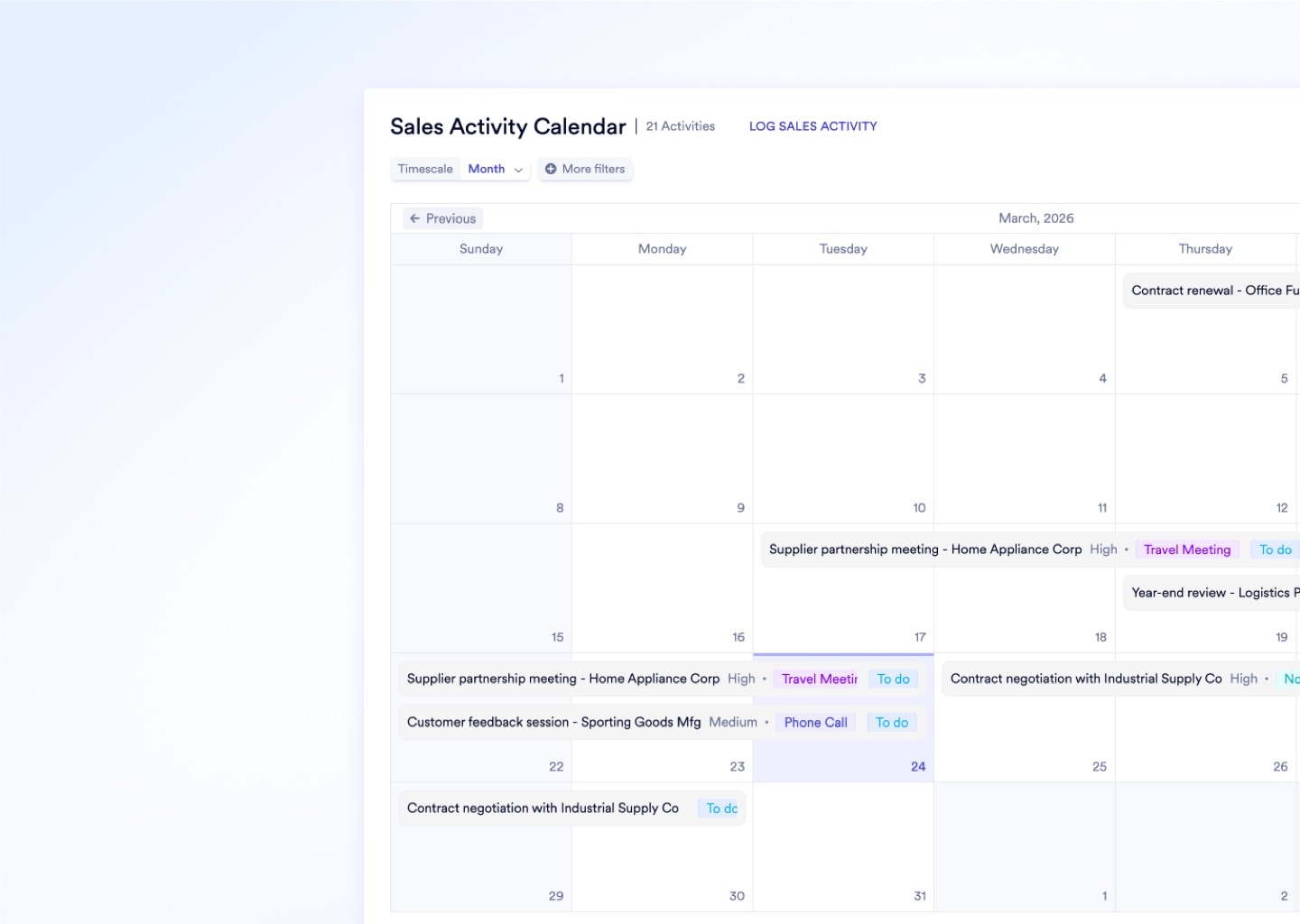 Every activity, call, and meeting ties directly to the relevant opportunity, quote, or account. No orphaned calendar tasks.
