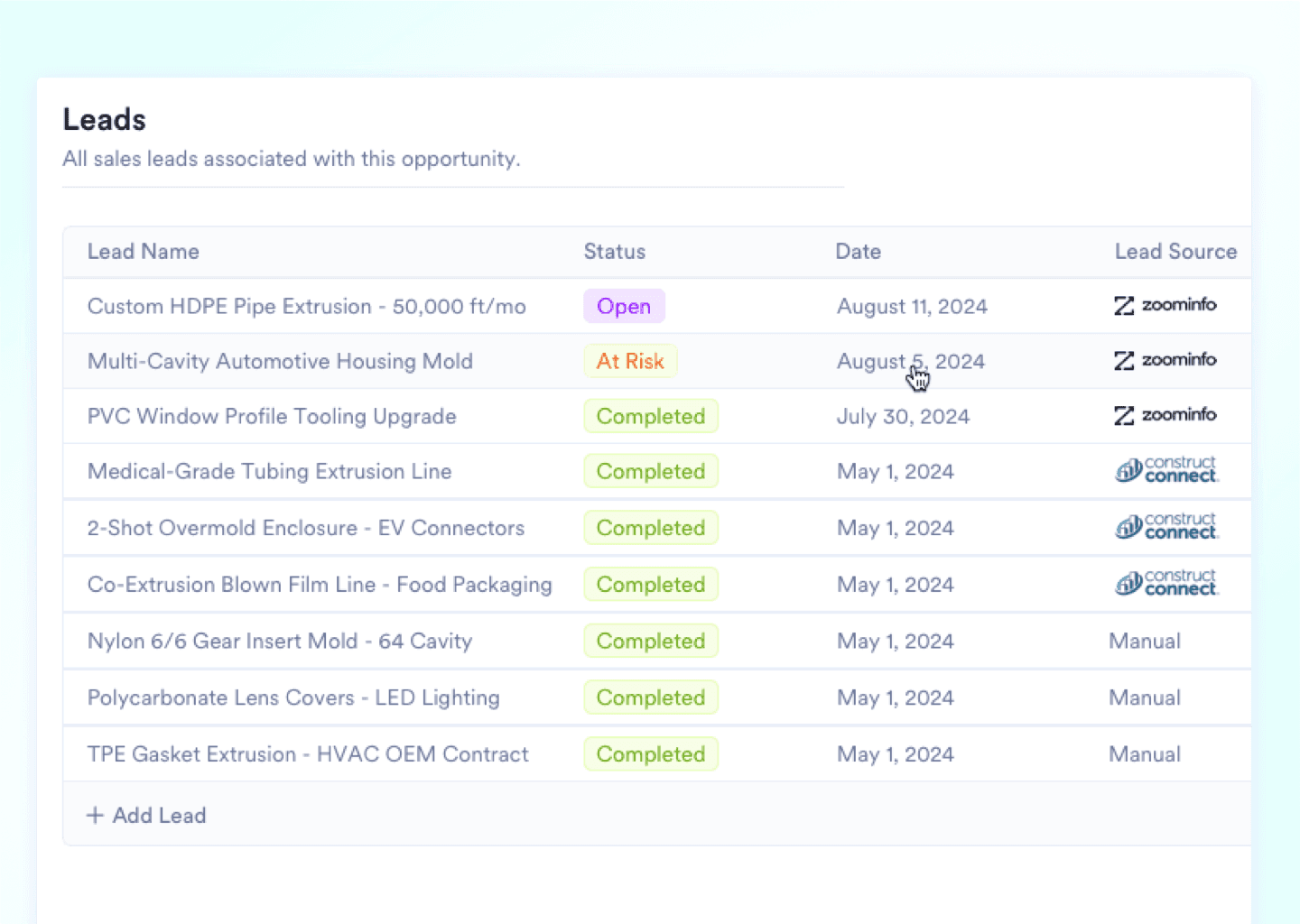 Stop paying for Salesforce or Pipedrive just to manage top-of-funnel leads. Naologic includes native lead management with status tracking, salesperson attribution, opportunity value estimation, and sales channel segmentation. Connect directly to enrichment platforms like Construct Connect and ZoomInfo via API and let automated pipelines pull qualified prospects into your workspace overnight.