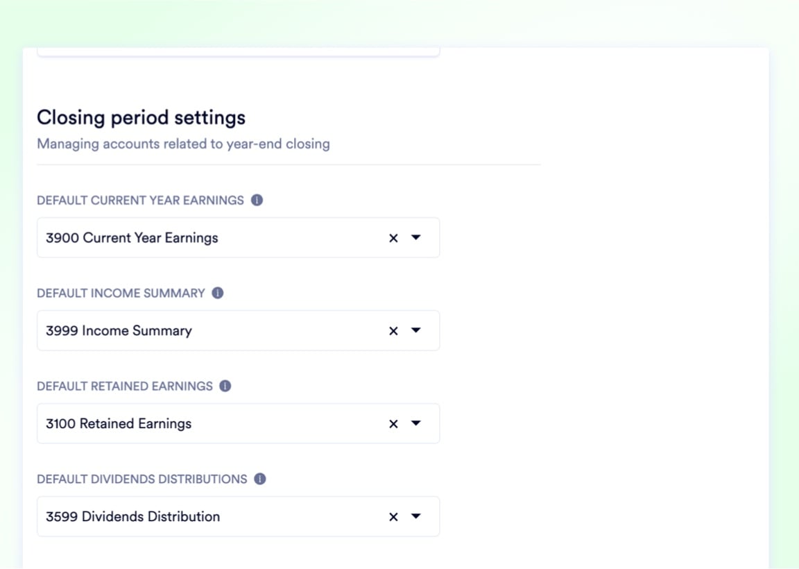 Map your retained earnings and income summary GLs once. The system auto-calculates and posts the complex rollover entries when you close the fiscal year.