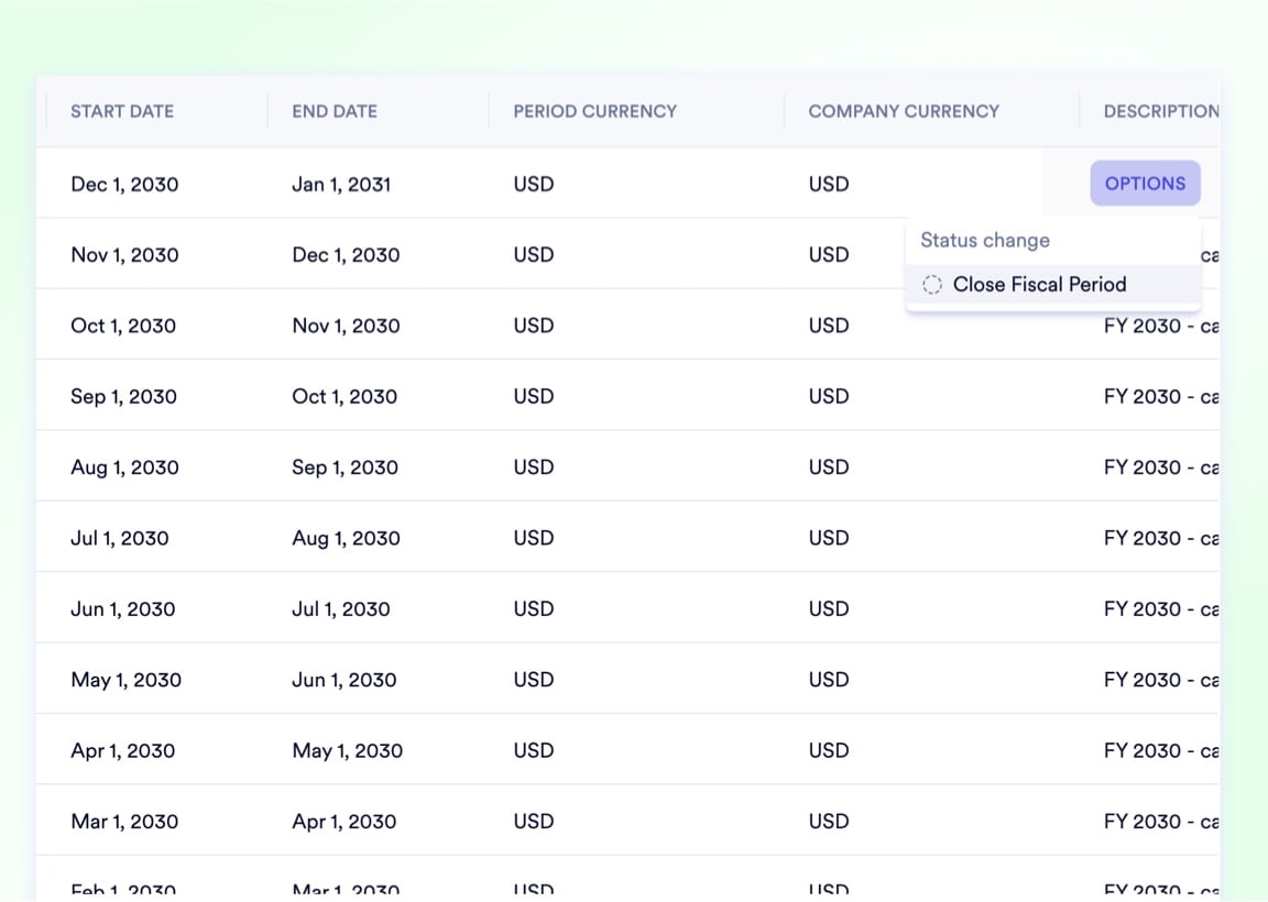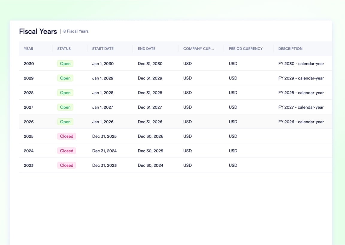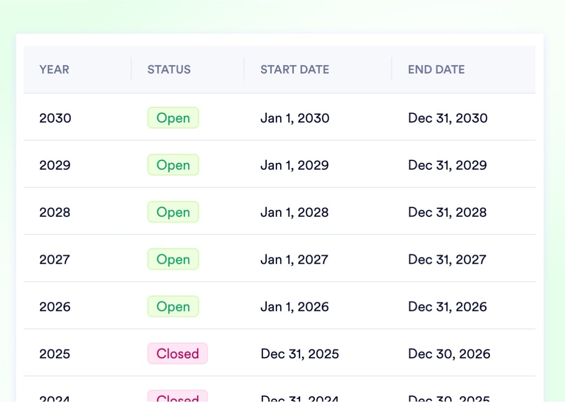 Custom fiscal years, strict period locks, and automated year-end sweeps give your finance team the structure to close accurately and the controls to protect historical data permanently.