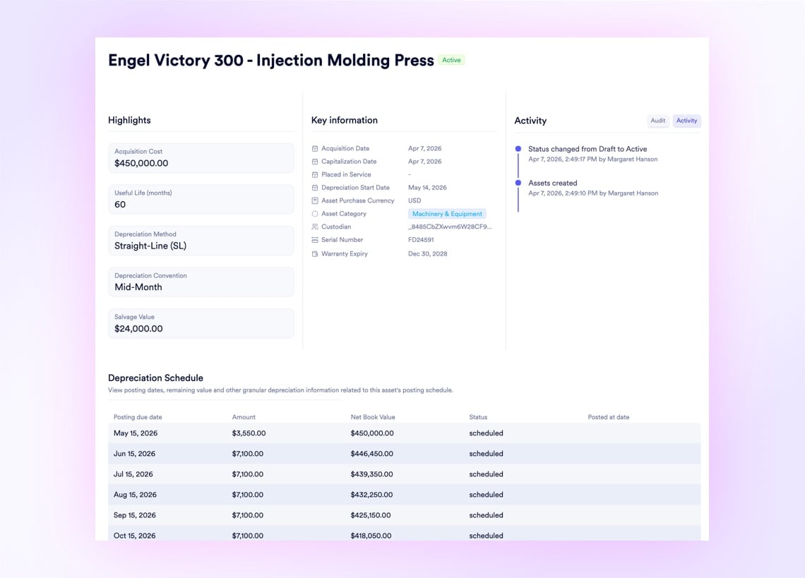 Manage millions of dollars in machinery from a single registry. Map parent-child equipment hierarchies, assign custodians and warehouse locations, and track serial numbers and warranty expirations natively. The system auto-generates month-by-month depreciation schedules for the entire useful life of every asset - Straight Line or Double Declining Balance, your choice. Net Book Values update dynamically after every posted depreciation event.