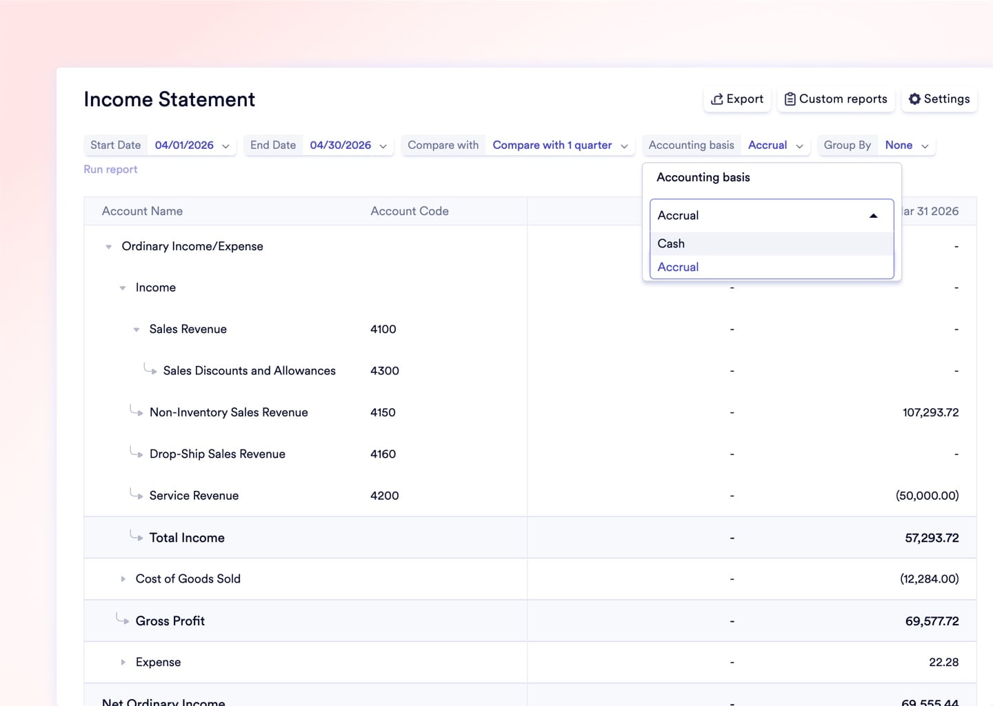 Corporate tax year starts in July? Configure your fiscal year start date freely. Period numbering adjusts so July is properly labeled "Period 1."