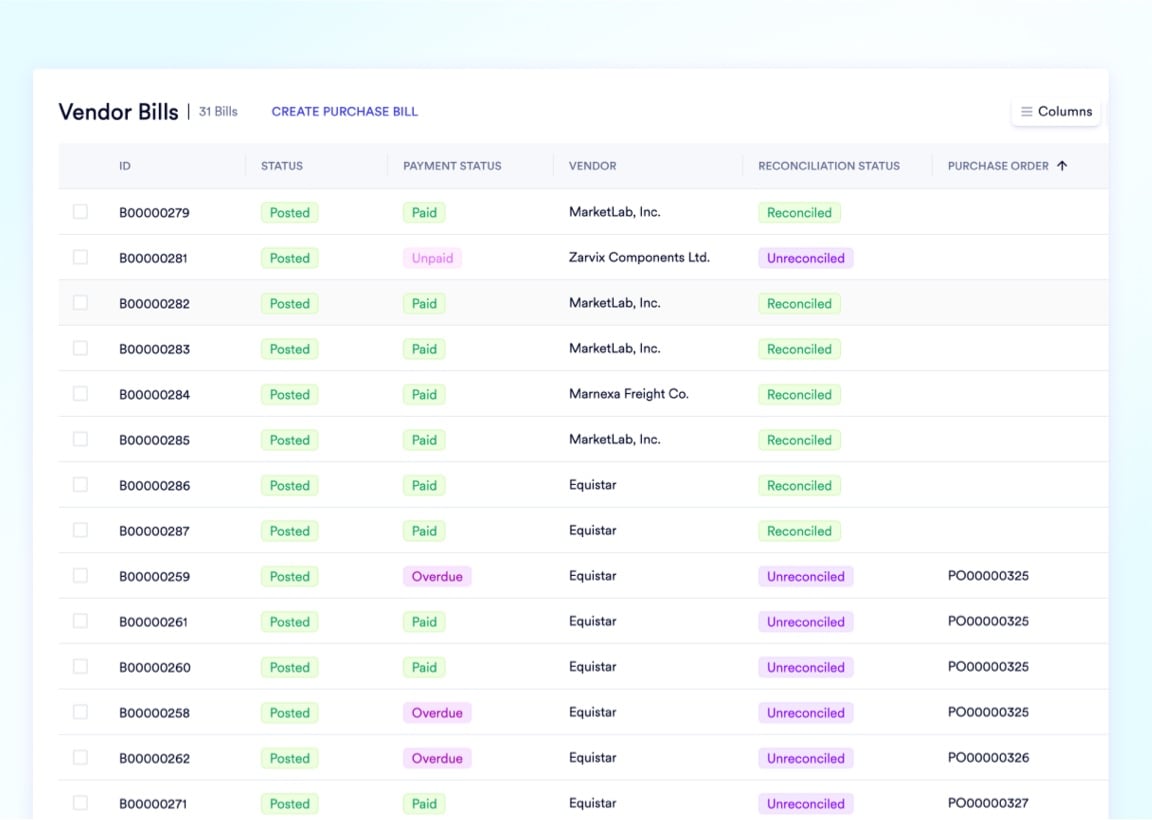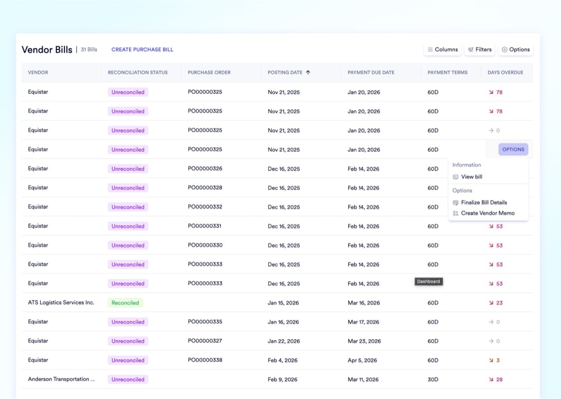 Bills enter your AP dashboard with full vendor, amount, and term data. Expand any bill to match it against the originating Purchase Order and Goods Receipt for instant 3-way verification.
