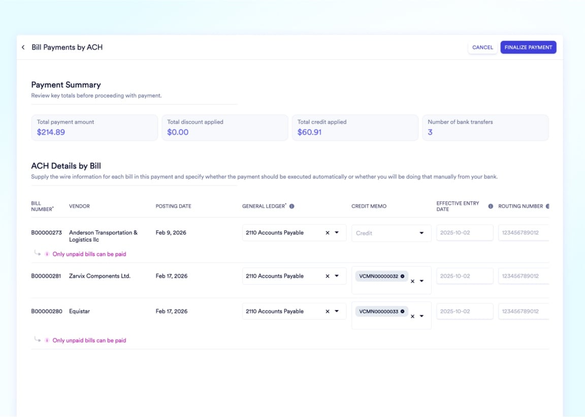 Select verified bills. Choose ACH, wire, or check. For ACH, assign per-bill banking details. For wire, consolidate per vendor. For checks, preview and sequence. Credits apply automatically.