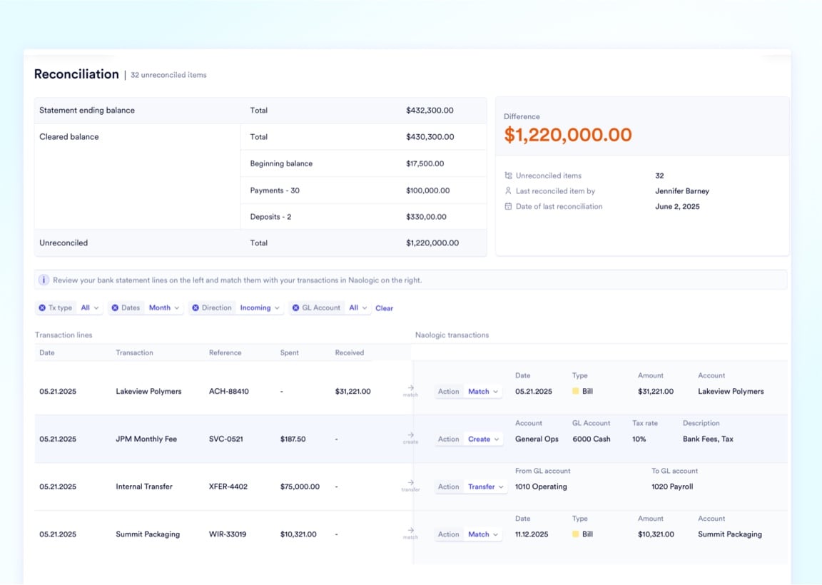 Naologic replaces the broken AP workflow of paper dock receipts, multi-screen ERP workarounds, and disconnected banking portals with a unified payables command center. Match vendor bills to POs and goods receipts natively. Execute ACH, wire, and check payments without leaving the system. Reconcile against your bank feed with AI.