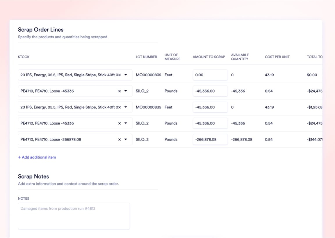 Formal scrap orders mandate an internal memo for root-cause tracking and automatically post the financial write-off to the designated Scrap GL account - no manual journal entries and no undocumented inventory loss.