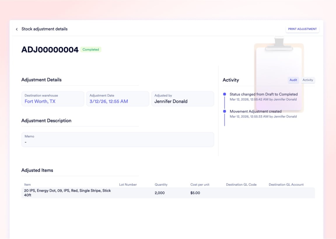 Every quantity correction requires an Adjustment Reason that routes the financial delta to the appropriate GL. Positive and negative variances are logged with user ID, timestamp, and full financial attribution.