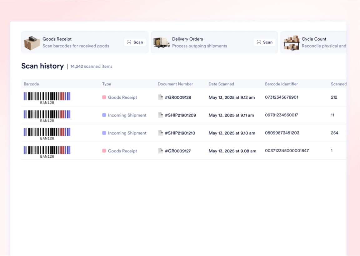 A centralized, immutable log of every scan event across your facility. See which operator scanned which barcode, the originating module (Goods Receipt, Job Sheet, Transfer), and the exact timestamp for complete diagnostic auditing.