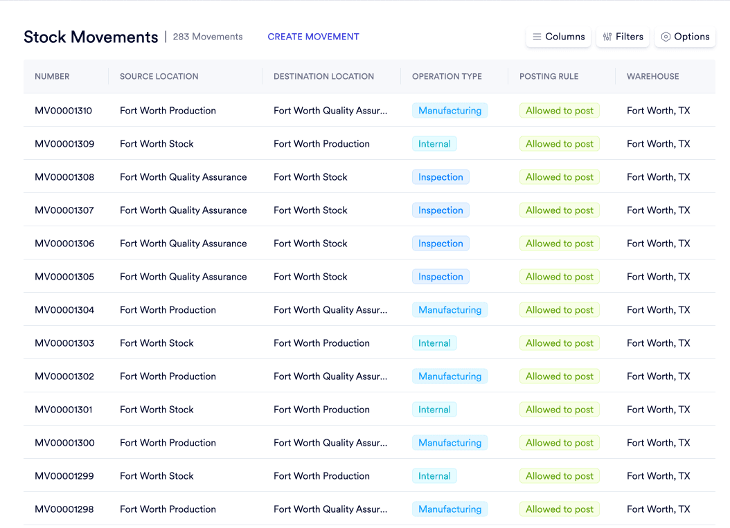 Movement History shows the exact unit cost at time of transfer, the total financial value of the movement, and the specific GL accounts debited and credited - not just a bin-to-bin transfer log.
