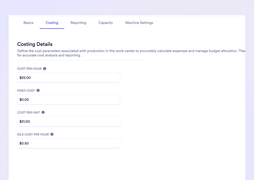 Your CNC and your packing table do not cost the same to run. Define exact hourly burn rates per machine combining depreciation, utilities, and maintenance - so your quotes reflect reality, not guesswork.