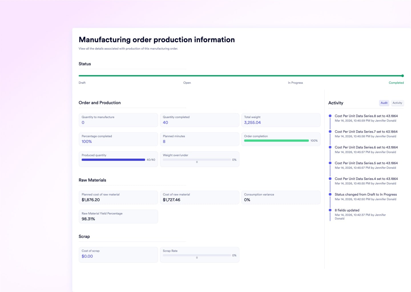 No more exporting production data to a disconnected quality system. Inspections, NCRs, and CoCs live inside the same platform where your Manufacturing Orders run.