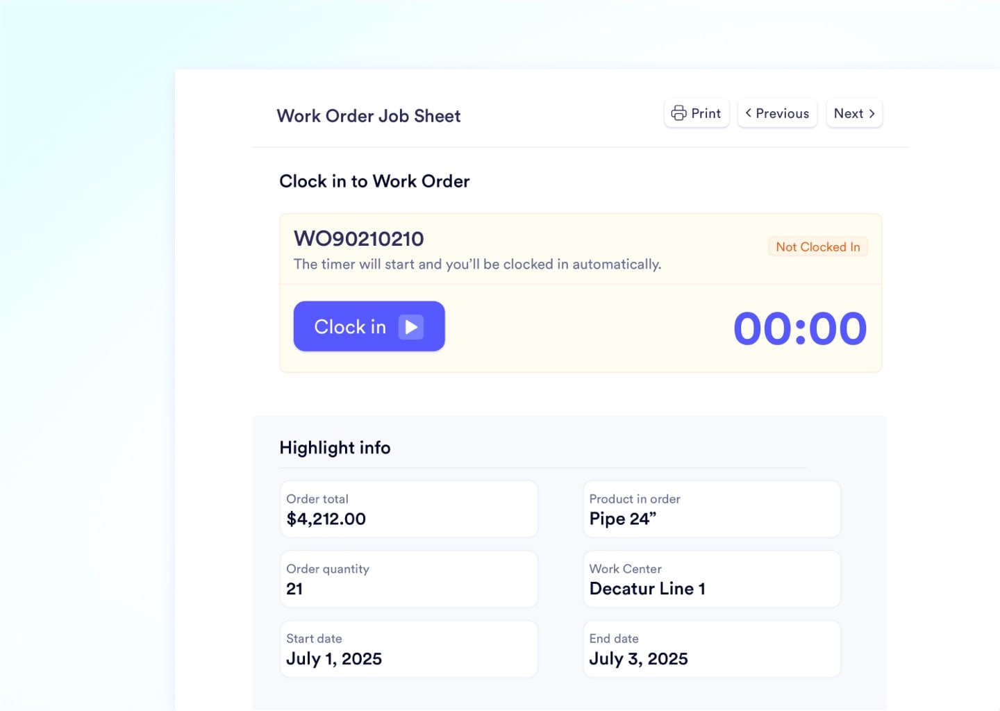 Operators tap 'Start' and 'Stop' per work order. The system records to-the-second timestamps and automatically allocates the financial cost to the job.