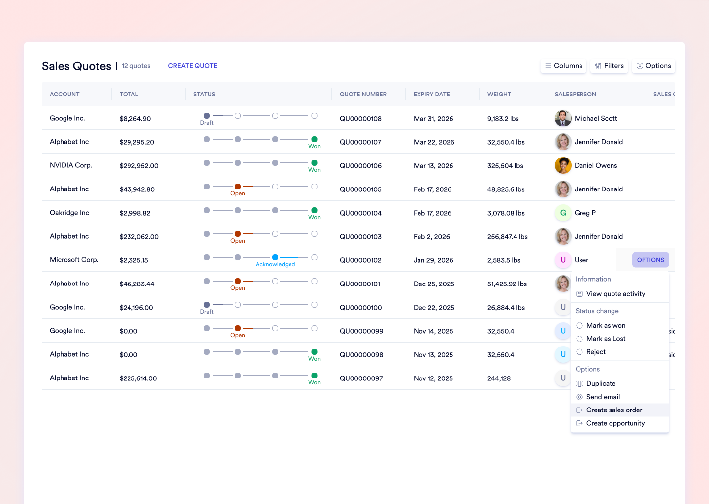 Velocity from lead to cash Every stage of the revenue cycle is connected. Leads convert to opportunities. Opportunities generate quotes. Quotes auto-convert to orders. Orders trigger fulfillment. No manual handoffs, no re-keying, no broken syncs between departments.
