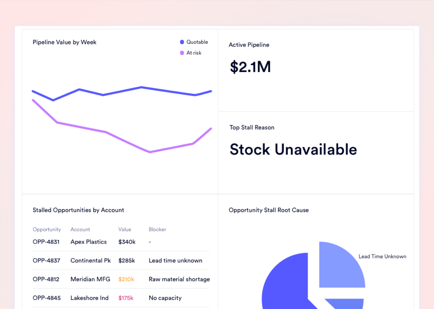 Track deal value and ownership while checking live inventory and production capacity. Reps never promise what the plant cannot deliver.