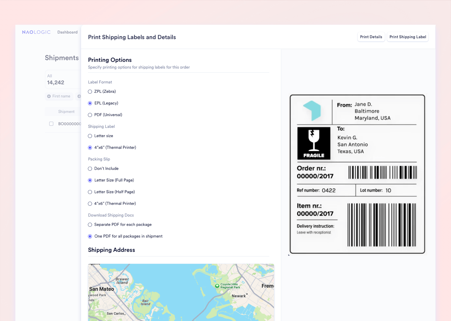 Naologic's automated inventory checks verify that every item has passed QA before a shipping label can be printed. E-signatures capture chain of custody on handover. Delivery exceptions auto-generate replacement manufacturing orders.