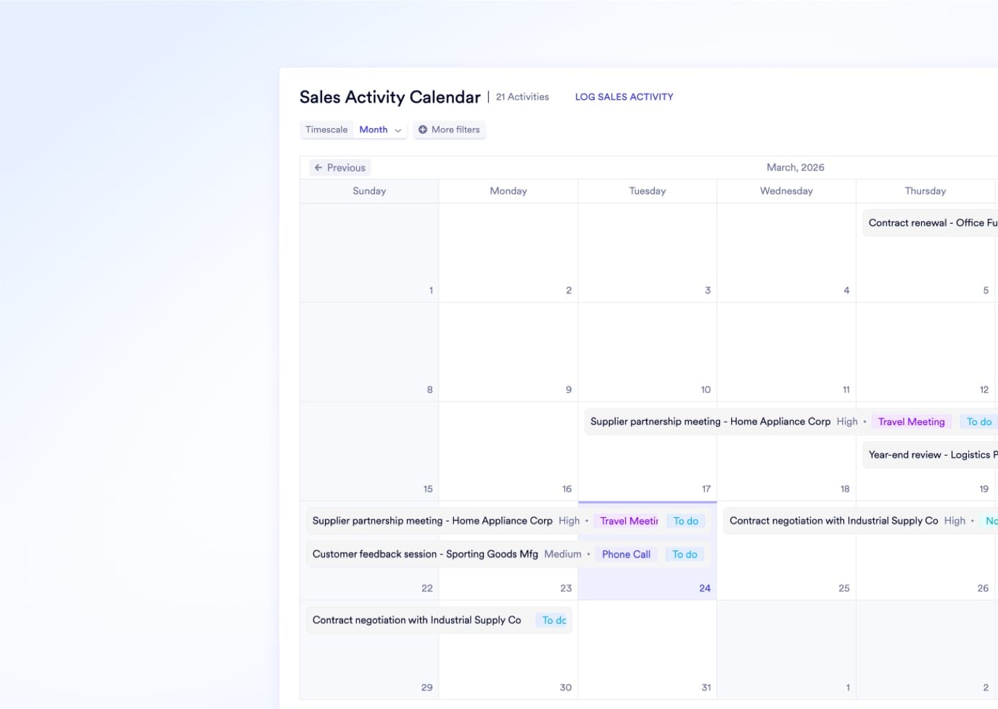 Source leads via API, manage opportunities on a visual Kanban board, and track every call, meeting, and follow-up across your sales team. Activities link directly to quotes, orders, and accounts for total context on every interaction.