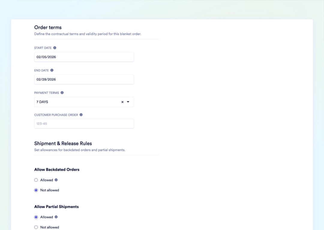 Define total volume, pricing terms, and expiration date in one blanket record. Every child order consumes directly from this master balance.