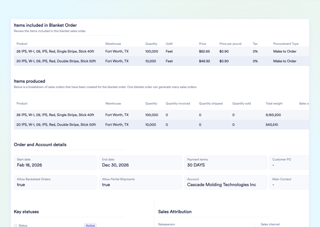 Naologic replaces your spreadsheet-tracked contracts with a structured, native blanket order system. Establish the commitment, track every release, and let the system handle the math so your team focuses on the relationship.