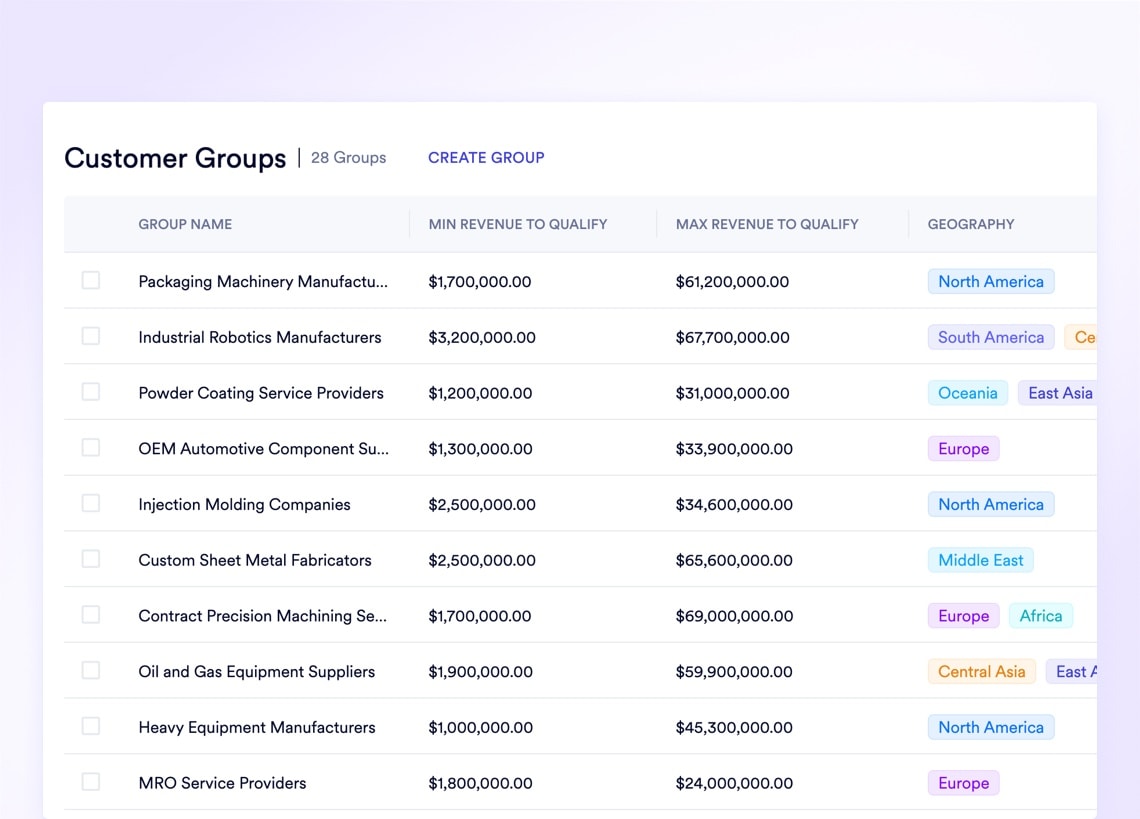 Rolling out a 5% price increase across 500 "Tier 2" customers should not require weeks of manual, account-by-account updates. Define customer groups based on revenue thresholds, geography, or employee count. Assign targeted price lists, discount rules, and payment terms to the group, and every member account inherits the configuration instantly. When the market shifts, update once and reach hundreds.