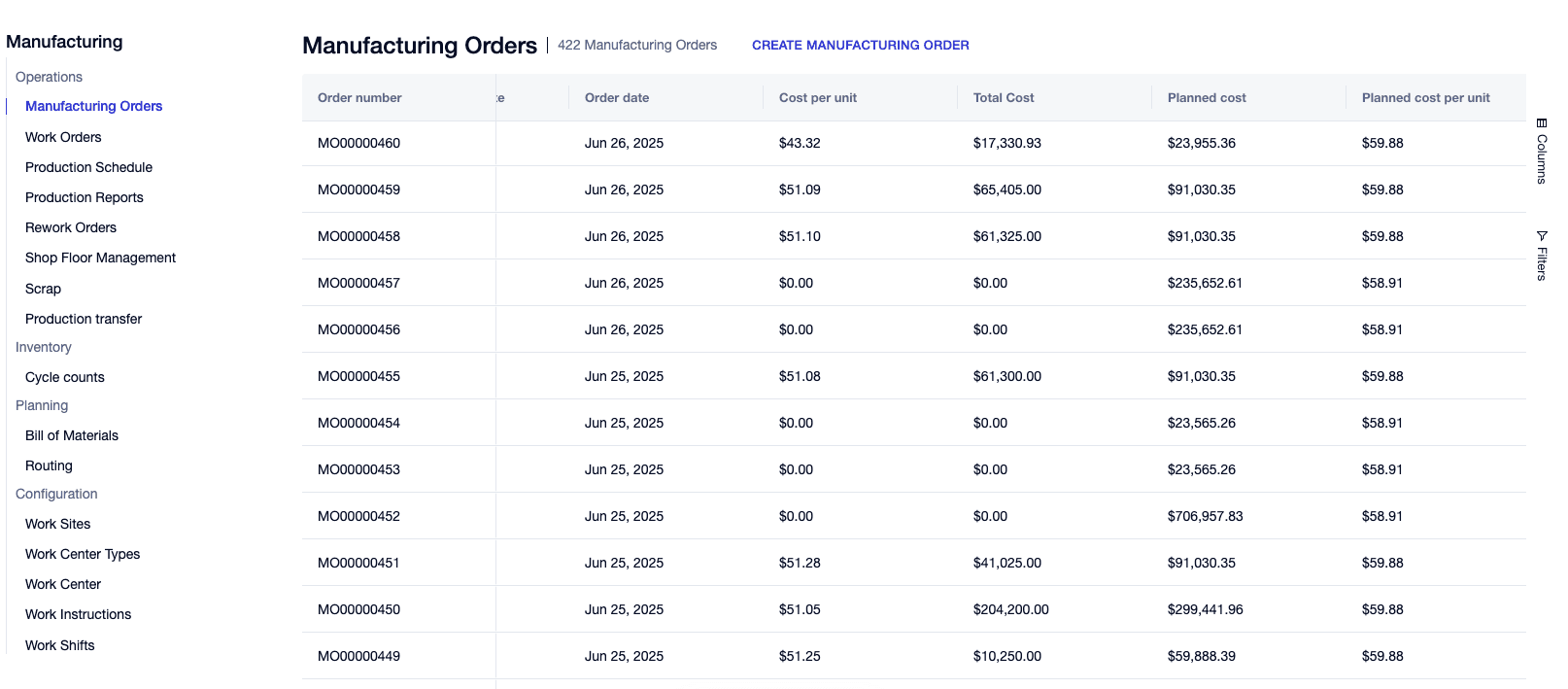 Track planned vs actual costs with scrap and downtimes