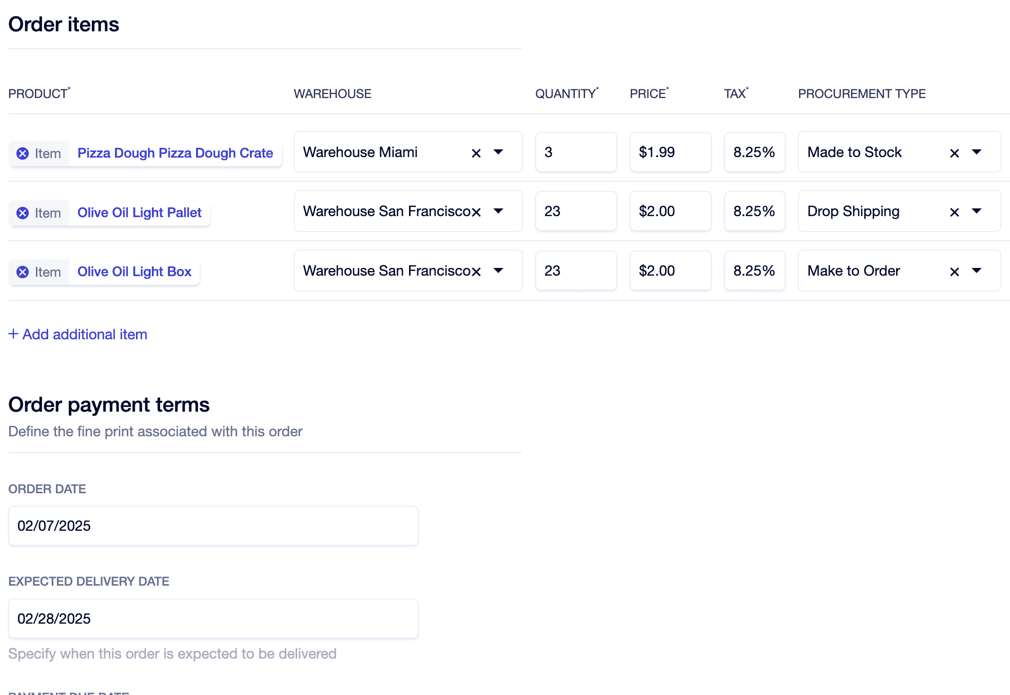 Create quotes and orders with multiple procurement types from multiple warehouses