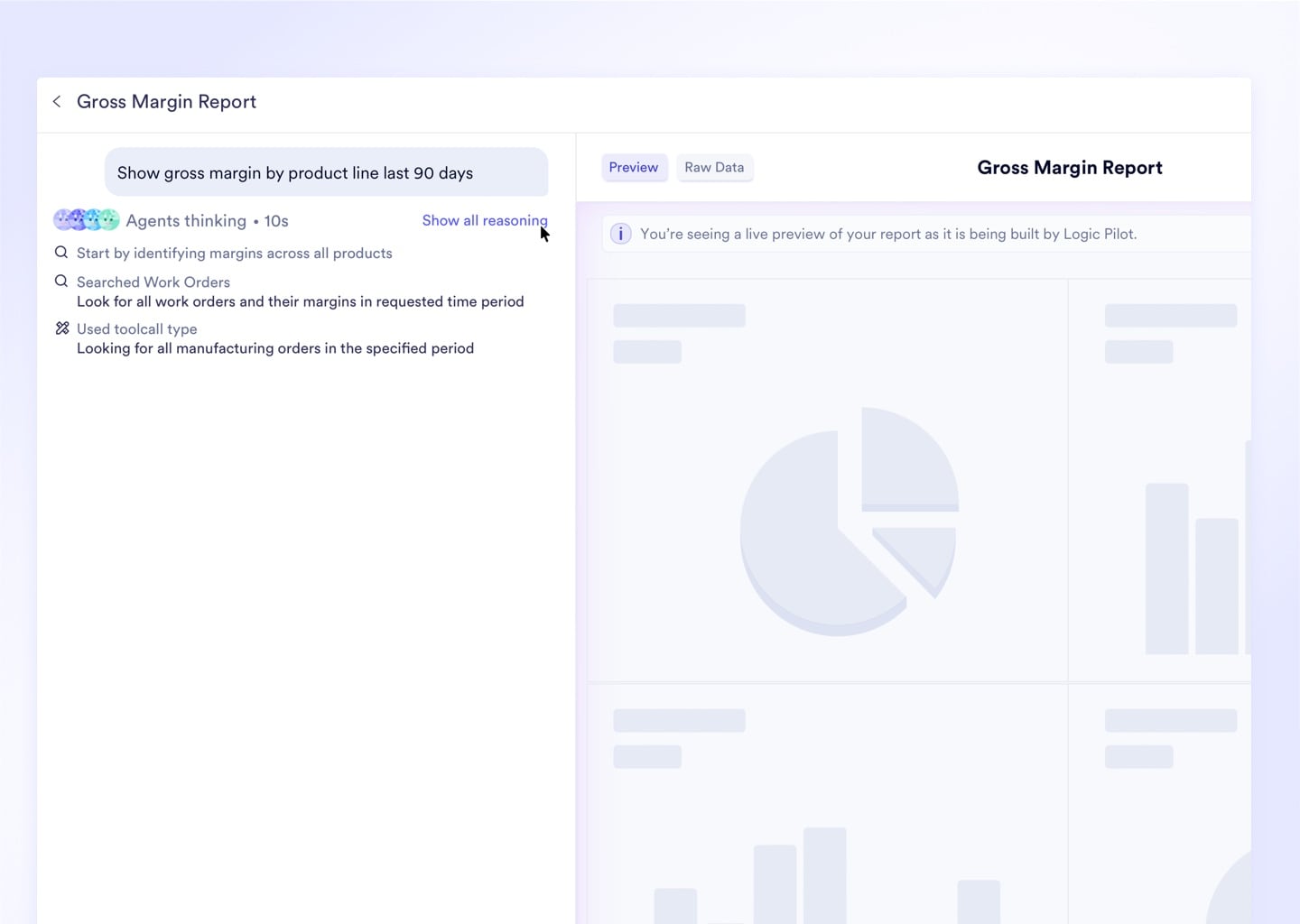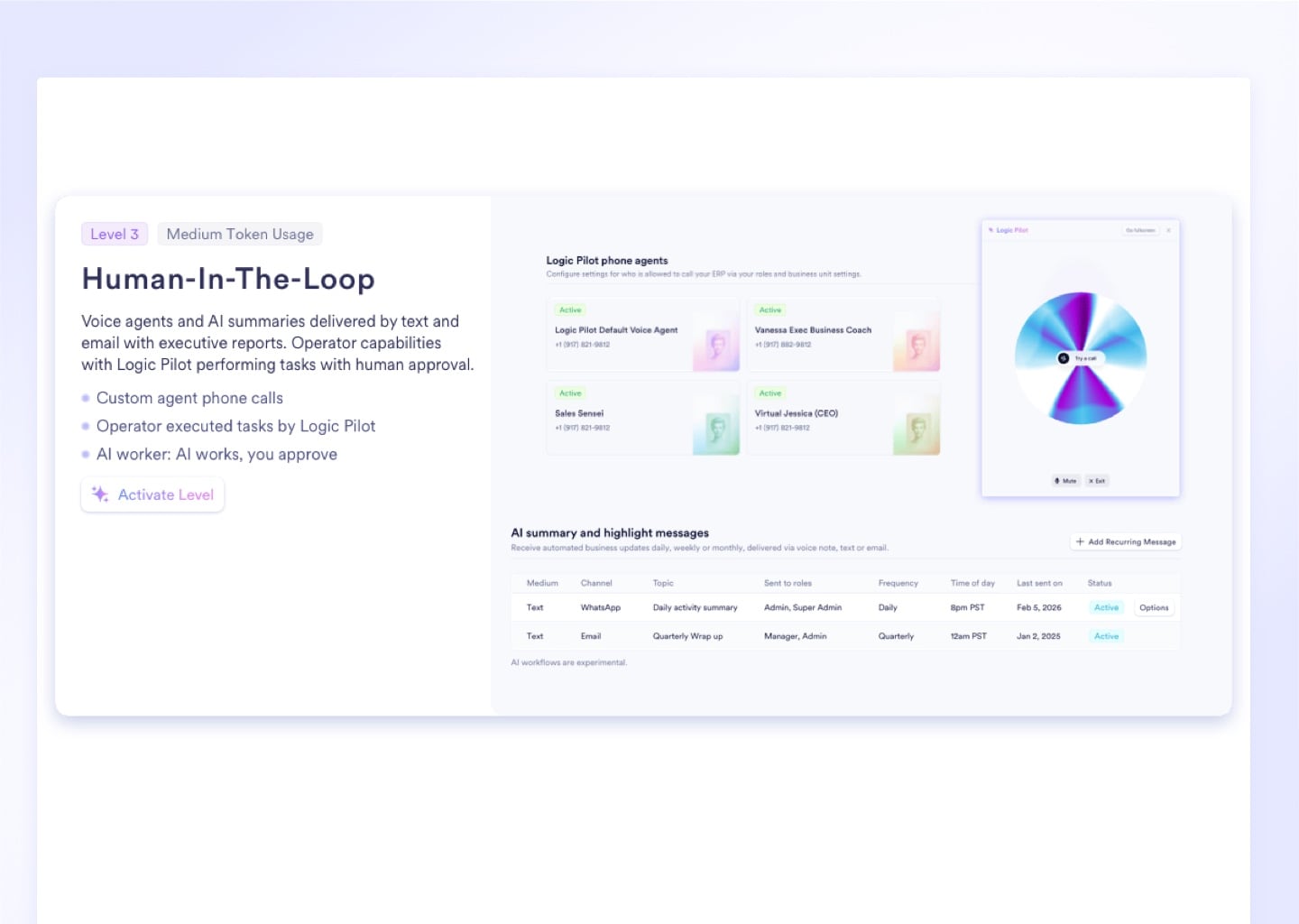 Configure exactly how much the AI executes - from Level 1 conversational assistance to Level 5 autonomous module building - with every action logged in the global audit trail regardless of tier. At Level 4, Logic Pilot autonomously generates RFQs, routes orders, and nourishes CRM leads, delivering a progress report to your phone when the work is done.