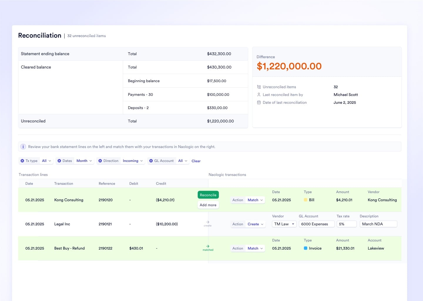 Periods & Close, Bank Reconciliation, and Financial Reporting work as a unified system - AR, AP, and every bank transaction reconciled before the close bell rings. The trial balance with source document drill-down gives the CFO a clean chain of evidence with zero manual spreadsheet patching.