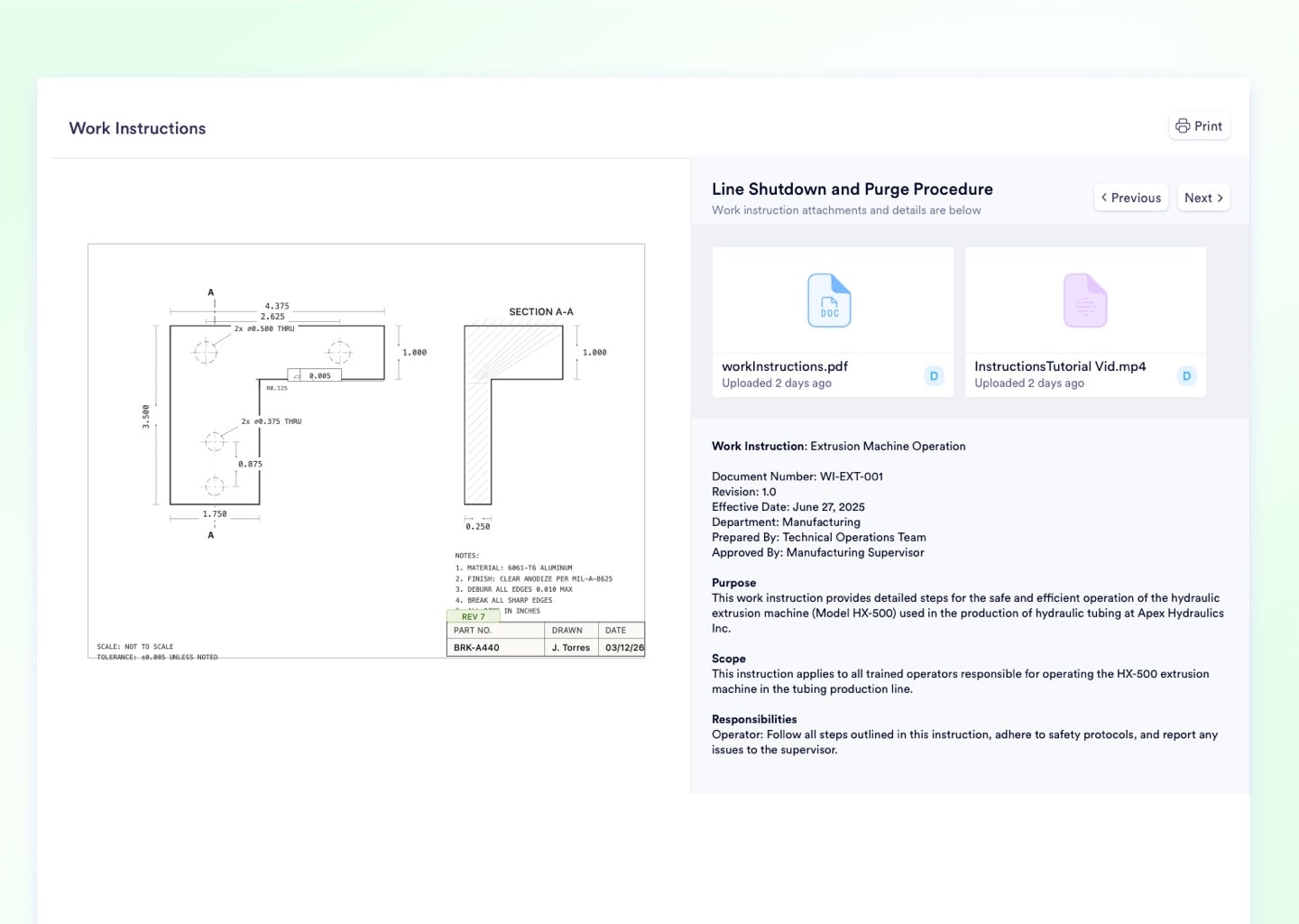 Engineers author SOPs once in the Work Instructions library with rich text, CAD diagrams, and multi-attachment support. When an operator opens any job step on their tablet, the exact current instruction version appears automatically - no searching, no outdated paper binders.