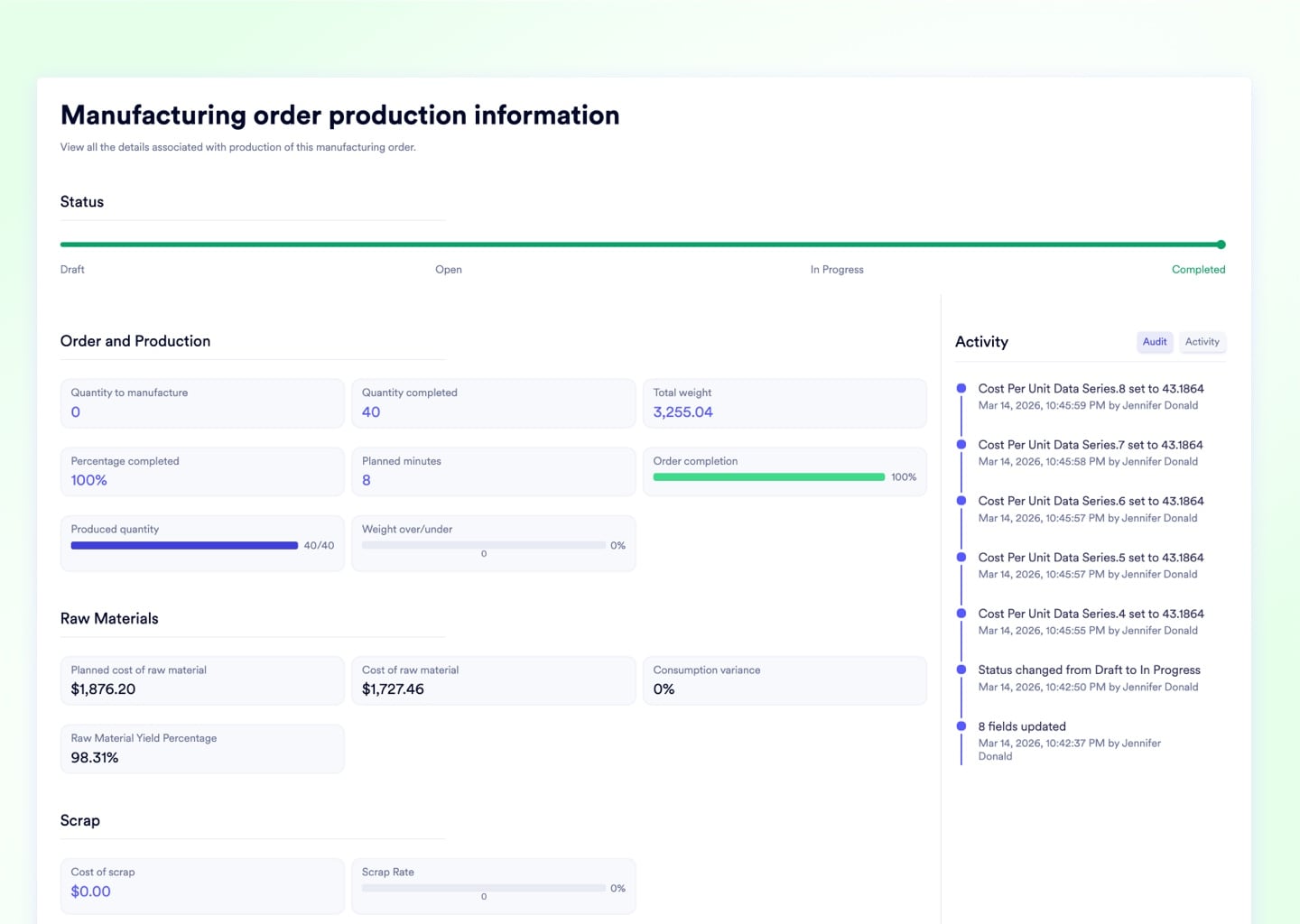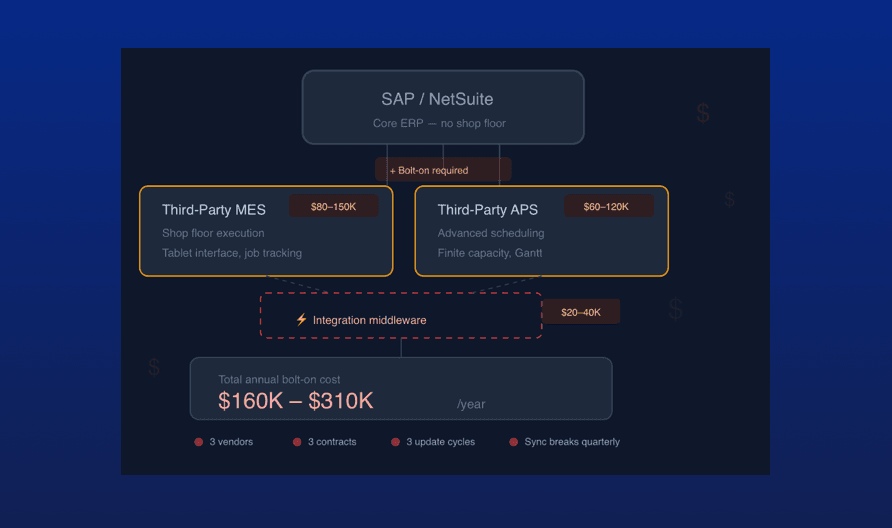 Every feature below was built to close the gap between what the schedule says and what the floor actually does. They span three modules - Manufacturing, QMS, and Inventory - because shop floor execution doesn't respect department boundaries.