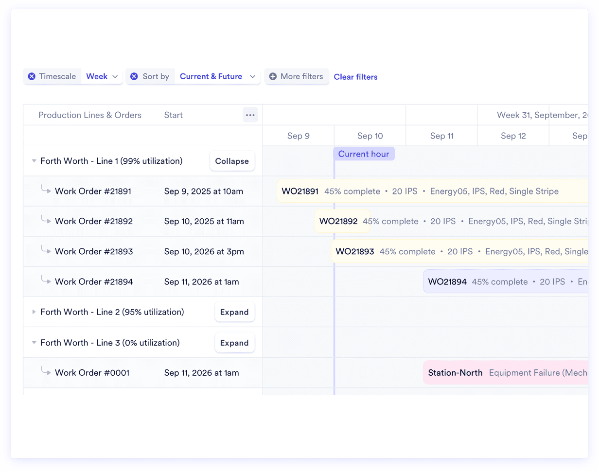 Finite Capacity Scheduling Drag-and-drop your production plan on a Gantt that mathematically enforces machine capacity, shift hours, setup blocks, and changeover penalties. Split massive orders across parallel machines, trigger Reflow to eliminate idle gaps, and re-route around downtime - without corrupting job costing data.